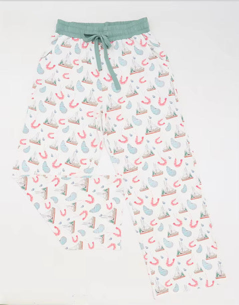 Bring the family together in style with the Core Sound Family matching pajama pants for mom and dad. Featuring playful shrimp, shrimp boats, and oyster designs, these cozy pants capture the charm of the core sound.